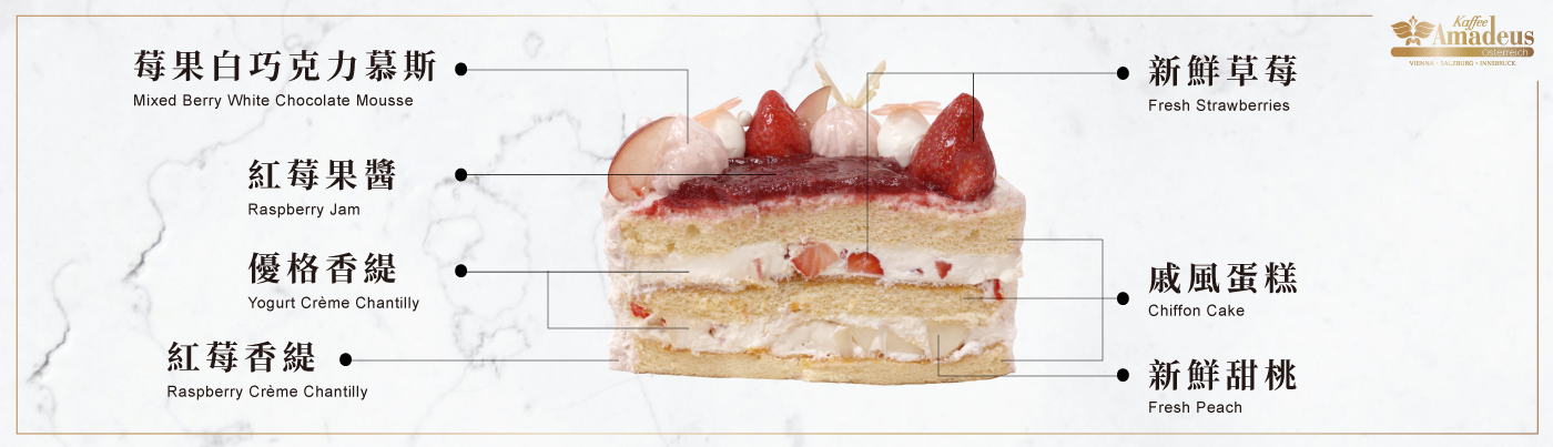 柔軟細緻的戚風蛋糕,搭配滑順輕盈的優格香緹與紅莓香緹,再佐以莓果白巧克力慕斯與紅莓果醬,口感清甜淡雅。是果香與乳香交織出溫柔平衡的春日風味。